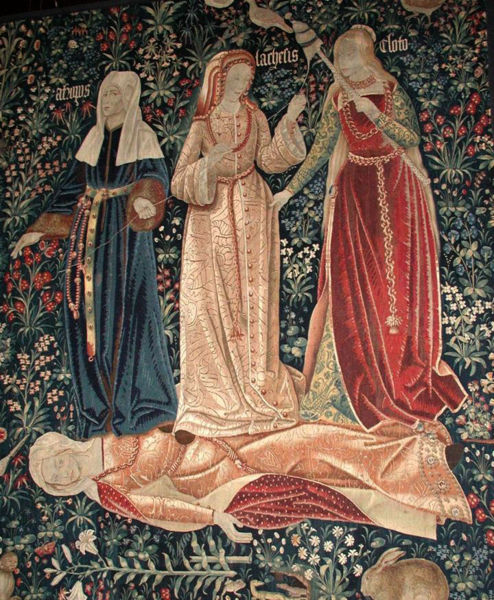 С распространением ткачества у многих народов (хеттов, греков, римлян) мойры получают облик прядильщиц. Так впервые в греческой литературе их называет Гомер. Они мыслились в виде суровых старух, прядущих нити судьбы: Клото с веретеном в руке, Лахесис с меркой или весами, Атропос с книгой жизни и ножницами. Разрыв нити - смерть. Философ Платон, преобразуя народные верования, рисует мойр силами высшего небесного правопорядка, женщинами в белых одеяниях, с венками на головах, вершащими под музыку небесных сфер настоящее, прошлое и будущее. Он называет их дочерями богини Ананке, вращающей мировое веретено.